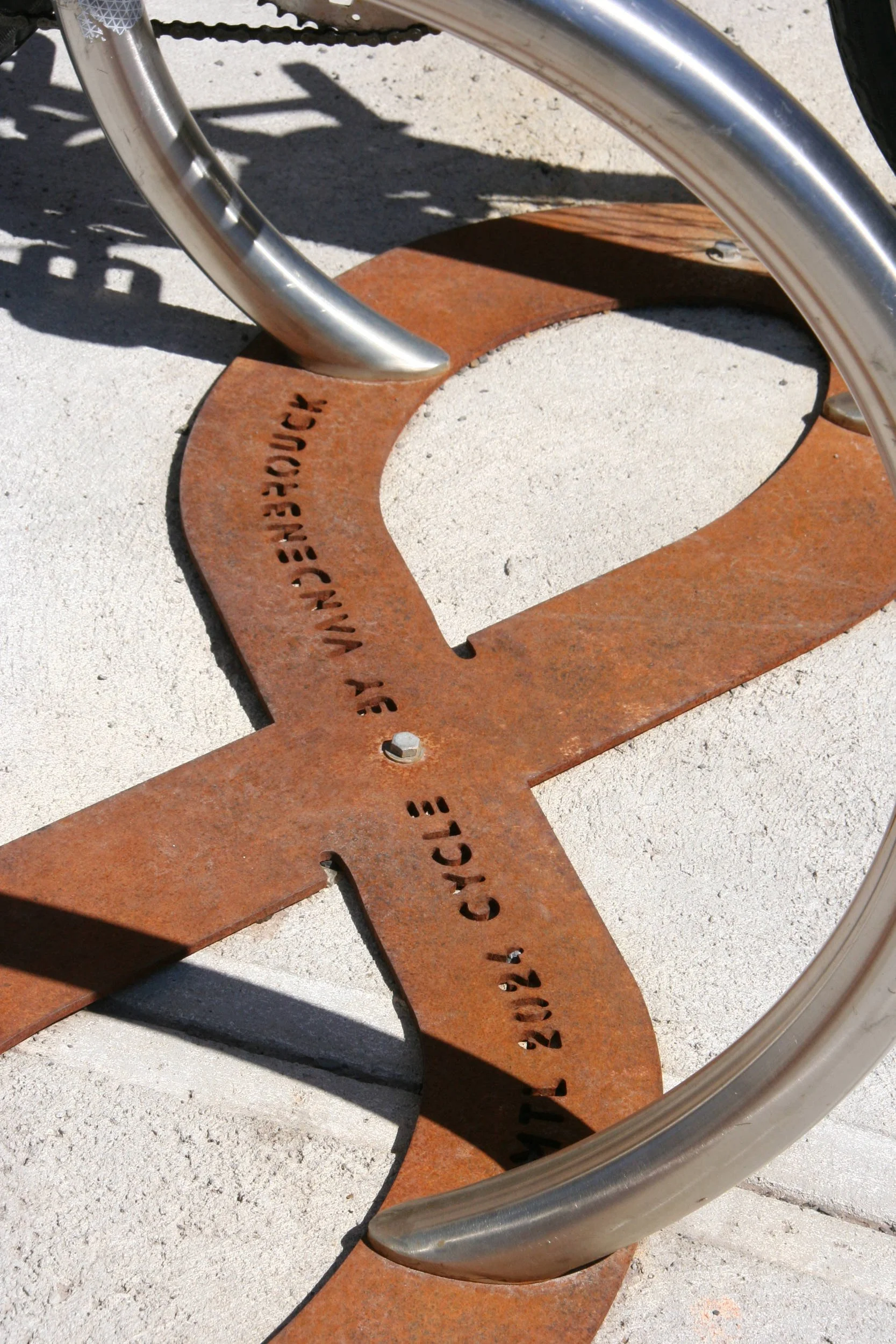 Les arches en acier inoxydable brossé reprennent la forme des roues des vélos stationnés, créant un rythme visuel qui évoque l’ordre et la cohérence. Elles cherchent ainsi à atténuer l’effet parfois chaotique d’un amas de bicyclettes. La base en acier corten, discrète, épouse la silhouette de l’ombre portée des arches, renforçant l’harmonie de l’ensemble. D’une capacité de six vélos, le CYCLOFIXE est un support qui conjugue efficacité, confort d’utilisation et intégration soignée dans le paysage urbain.